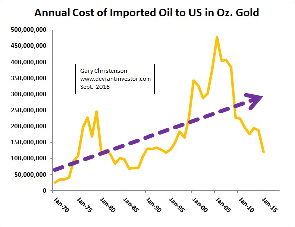 Bây giờ hãy xem xét chi phí dầu nhập khẩu được tính bằng ounce vàng theo giá bình quân mỗi năm. Chi phí tích lũy của dầu nhập khẩu từ năm 1970, nếu tính theo giá vàng, có thể là 8,2 tỷ ounce vàng.