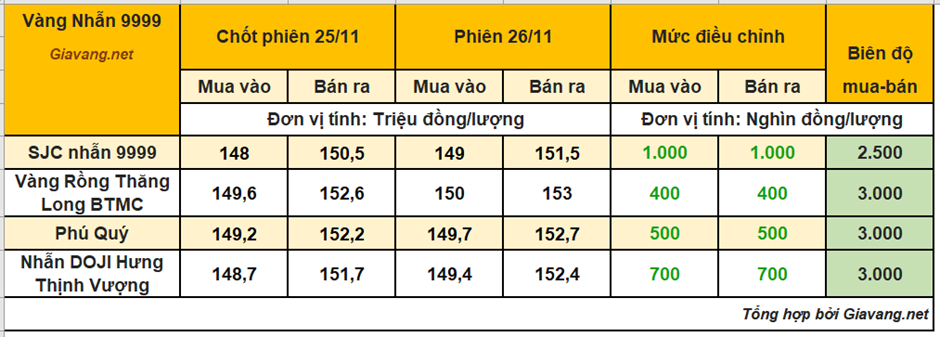DOJI Hà Nội và Hồ Chí Minh, niêm yết giao dịch mua – bán ở mức 151,4 – 153,4 triệu đồng/lượng, giá mua và giá bán cùng đi ngang so với giá chốt phiên 26/11.