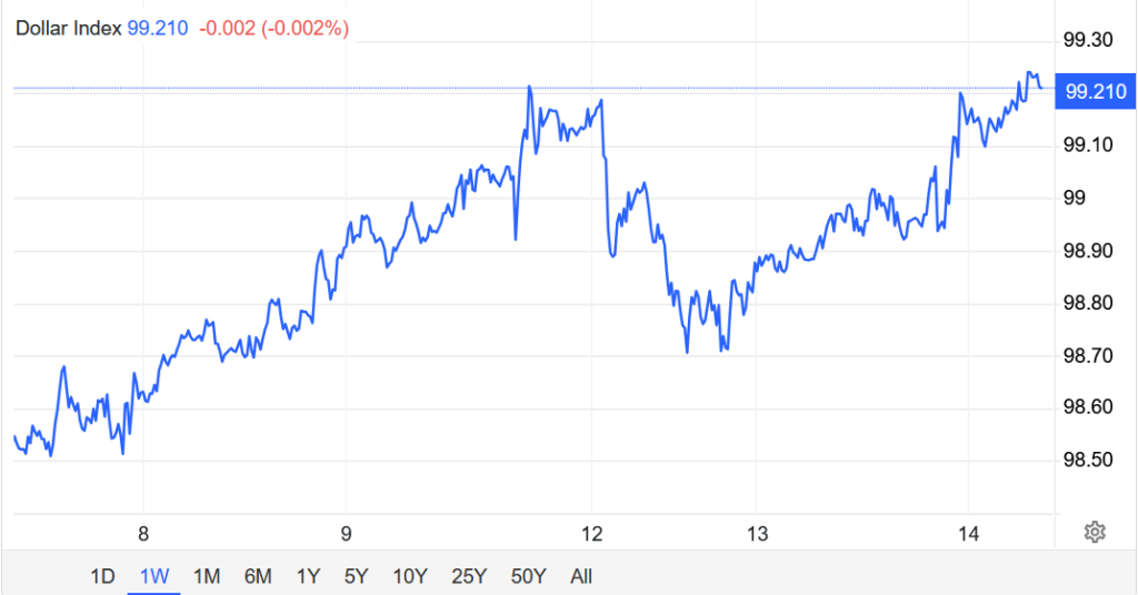Hôm thứ Ba, Chỉ số DXY tiến lên mốc 99 khi các dữ liệu lạm phát mới nhất hầu như không làm thay đổi triển vọng chính sách tiền tệ của Cục Dự trữ Liên bang Mỹ (Fed) trong ngắn hạn.