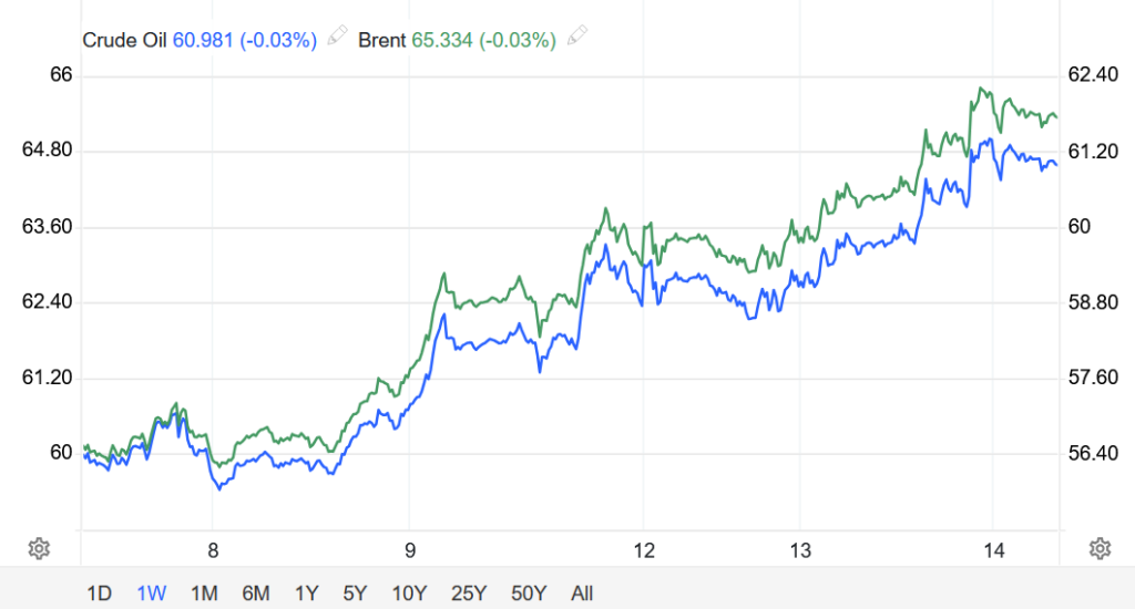 Khép phiên ngày 13/01, hợp đồng dầu WTI tương lai tăng 1,65 USD, tương đương 2,77%, lên 61,15 USD/thùng.