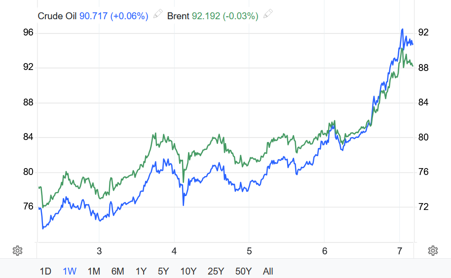 Trong khi đó, dầu Brent tăng 8,52%, tương đương 7,28 USD, lên 92,69 USD/thùng.