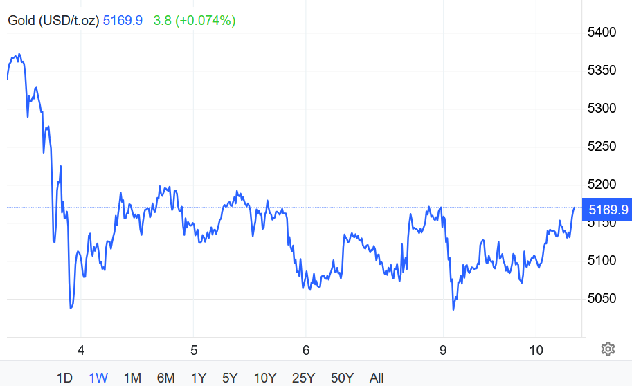 Cùng chiều, hợp đồng vàng tương lai của Mỹ giao tháng 4 chốt phiên giảm 1,1% xuống $5103,70/oz.