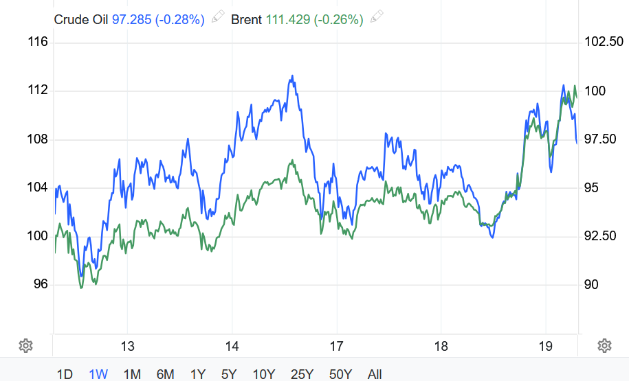 Trong khi đó, giá dầu WTI của Mỹ gần như đi ngang, chốt ở 96,32 USD/thùng.
