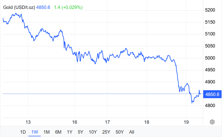 Giá vàng giao ngay giảm 2,2% xuống $4.895,61/oz.