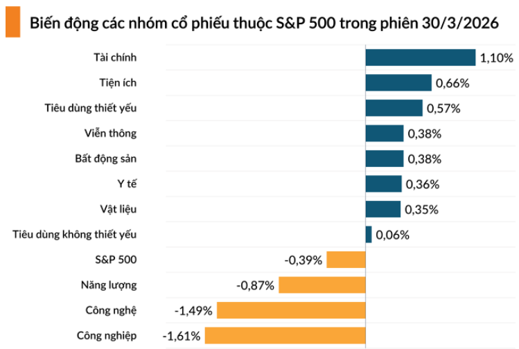 Bảng điện tử S&P 500 ghi nhận sự phân hóa giữa các nhóm ngành. Trong khi cổ phiếu Tài chính dẫn đầu đà tăng thì nhóm ngành Công nghiệp – Công nghệ và Năng lượng lại chịu áp lực bán lớn.