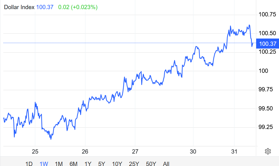 Chỉ số USD tăng vượt mốc 100 vào thứ Hai, lên mức cao nhất kể từ tháng 5 năm ngoái, khi chưa có dấu hiệu hạ nhiệt của cuộc chiến tại Trung Đông khiến thị trường tiếp tục ưu tiên nắm giữ tài sản an toàn là đồng bạc xanh.
