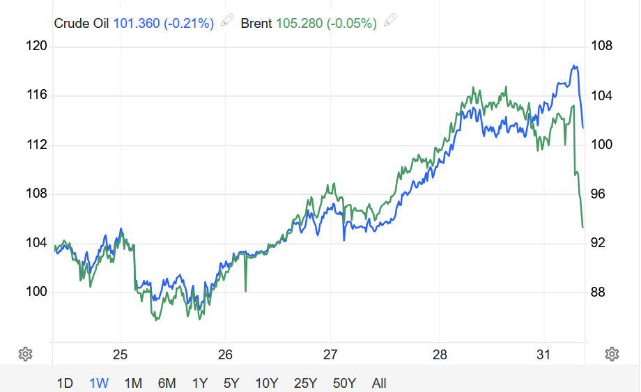 Khép phiên ngày 30/03, hợp đồng tương lai dầu Brent giao tháng 5 tăng 0,19%, tương đương 21 xu, chốt ở mức 112,78 USD/thùng. Tính chung tháng 3, dầu Brent đã tăng khoảng 55% – mức cao kỷ lục kể từ khi hợp đồng này ra đời năm 1988. Kỷ lục trước đó là mức tăng 46% vào tháng 9/1990 trong Chiến tranh Vùng Vịnh lần thứ nhất.