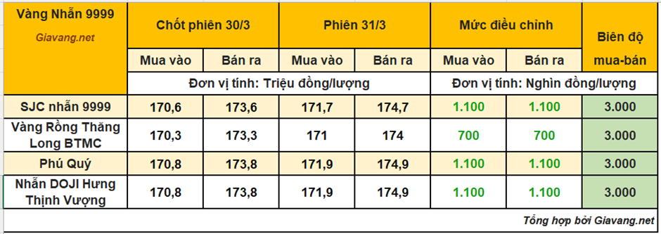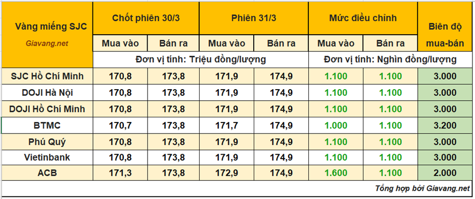 Cập nhật thời điểm 11h20 ngày 31/3, vàng miếng SJC Hồ Chí Minh niêm yết giao dịch mua – bán ở mức 171,9 – 174,9 triệu đồng/lượng, giá mua tăng 1,1 triệu và giá bán tăng 1,1 triệu so với cuối ngày hôm qua. Biến động giá SJC từ đầu giờ sáng nay gồm cả nhịp tăng và giảm.