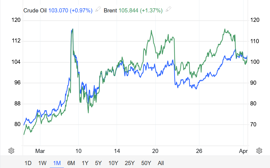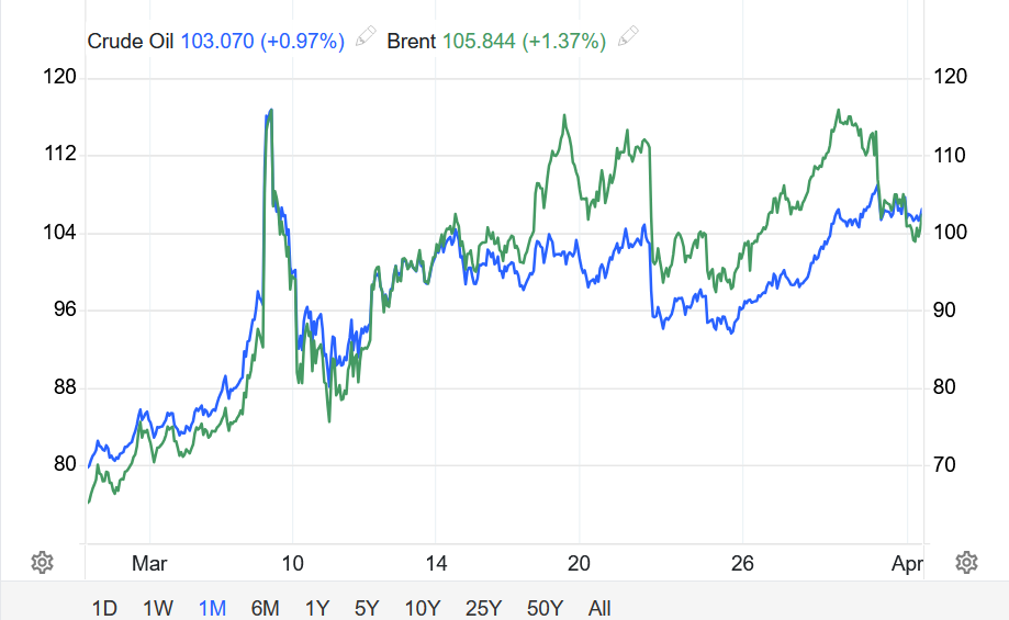 Hợp đồng dầu WTI tương lai giảm 1,46% xuống 101,38 USD/thùng, dù vẫn tăng khoảng 51% trong tháng 3 – mức tăng mạnh nhất kể từ tháng 5/2020.