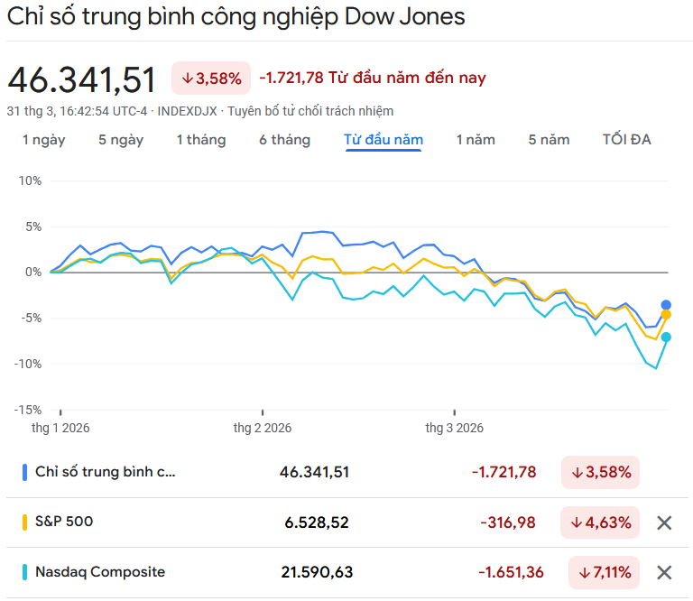 Khép lại tháng 3, chỉ số S&P 500 giảm 5,1%, ghi nhận kết quả hàng tháng tồi tệ nhất kể từ năm 2022. Chỉ số Dow Jones giảm 5,4%, chấm dứt chuỗi 10 tháng tăng điểm. Chỉ số Nasdaq Composite mất giảm 4,8%.