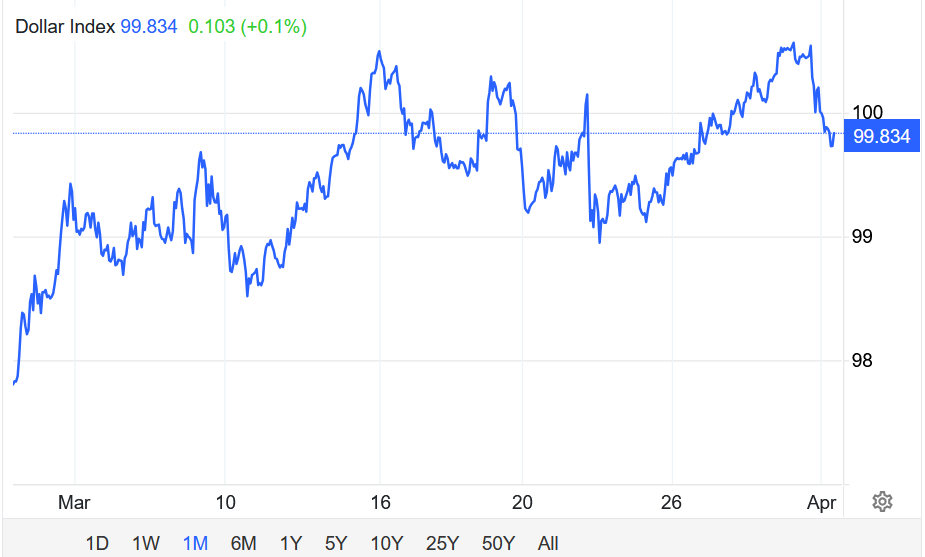 Chỉ số USD tăng vượt mốc 100 vào thứ Hai, lên mức cao nhất kể từ tháng 5 năm ngoái, khi chưa có dấu hiệu hạ nhiệt của cuộc chiến tại Trung Đông khiến thị trường tiếp tục ưu tiên nắm giữ tài sản an toàn là đồng bạc xanh.