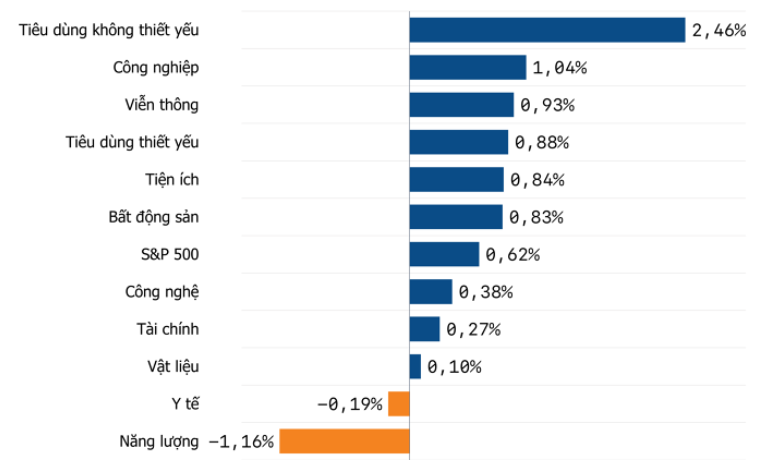 Bảng điện tử S&P 500 ghi nhận 10/11 nhóm ngành tăng giá, dẫn đầu là cổ phiếu Tiêu dùng không thiết yếu. Riêng ngành Năng lượng tiếp tục gặp áp lực bán.