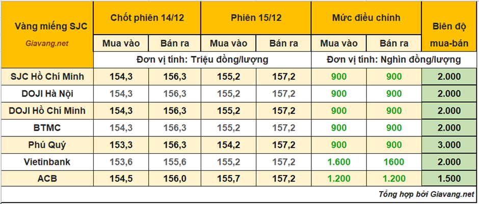 Trong khi đó, Nhẫn Phú Quý niêm yết giao dịch mua – bán ở mức 152 – 155 triệu đồng/lượng, giá mua và giá bán đều tăng 500 nghìn đồng mỗi lượng so với ngày 14/12.