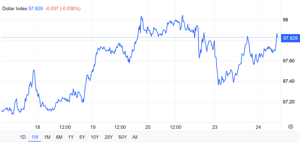 Chỉ số USD duy trì quanh mốc 97,8 vào thứ Hai, thu hẹp đà giảm đầu phiên để tiếp tục dao động gần mức cao nhất trong một tháng, khi thị trường toàn cầu đánh giá lại liệu những diễn biến mới trong chính sách thương mại của Mỹ có làm thay đổi đáng kể cán cân thanh toán hay không.