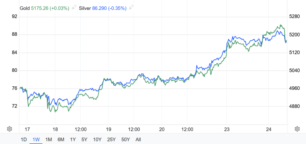 Vàng giao ngay tăng 2% lên $5206,39/oz, sau khi chạm mức cao nhất kể từ ngày 30/01 trong phiên.