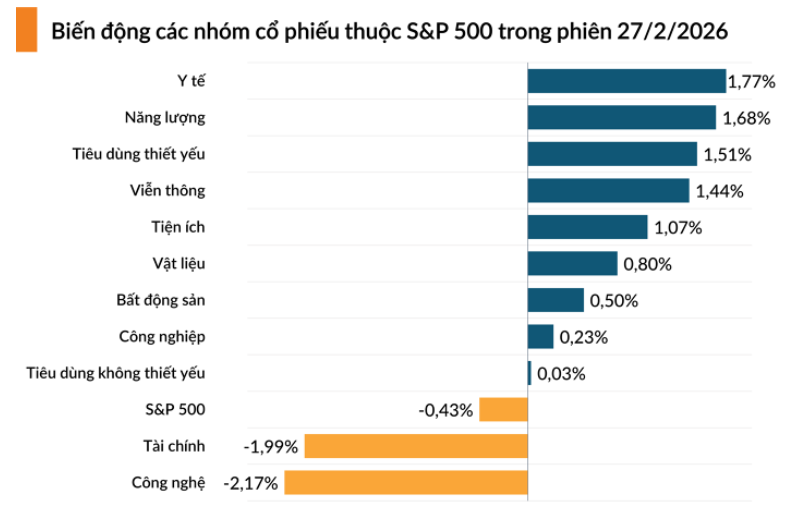 Kết thúc tháng 2, chỉ số Nasdaq Composite đã giảm hơn 3%, ghi nhận kết quả tồi tệ nhất kể từ tháng 3/2025. Trong khi đó, chỉ số S&P 500 đi xuống gần 1%, còn chỉ số Dow Jones tăng khoảng 0,2% trong tháng 2.