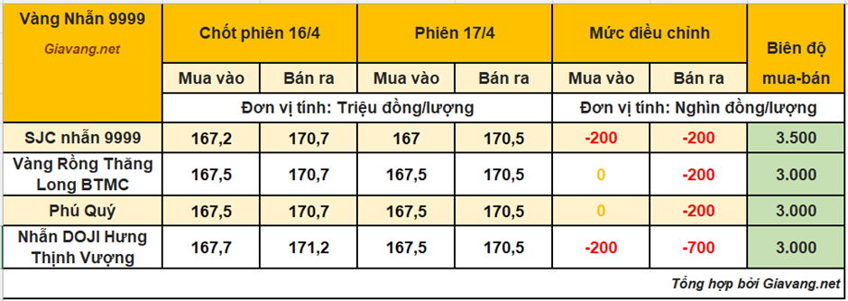 DOJI Hà Nội và Hồ Chí Minh, niêm yết giao dịch mua – bán ở mức 167,5 – 171,0 triệu đồng/lượng, giá mua giảm 200 nghìn và giá bán hạ 200 nghìn so với cuối ngày 16/4